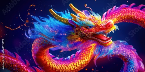 A brilliantly colored mythical dragon with piercing eyes and fiery breath