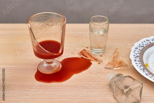 A broken glass, red tomato juice spilled on the table next to a bottle of vodka