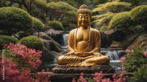 A bronze Buddha statue in pose for meditation in a Japanese garden among blooming greenery on a background of waterfall
