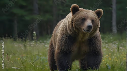 a brown bear that is walking through the grass