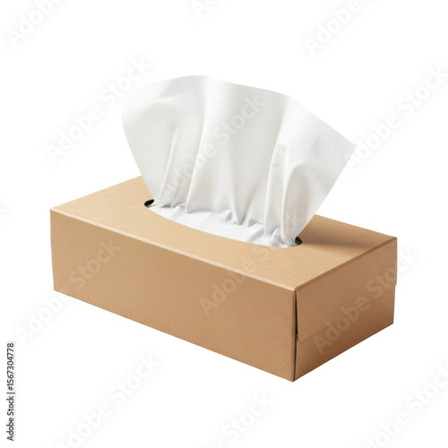 A brown cardboard box filled with white facial tissues, with one tissue pulled up and ready for immediate use for hygiene or cold relief.