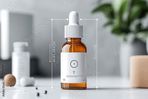 A brown glass serum bottle is displayed on a neutral surface, highlighting its minimalist label and elegant dropper in a serene environment