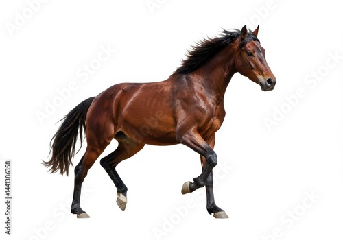 A brown horse in motion isolated on a white background showcasing its elegant and powerful stride