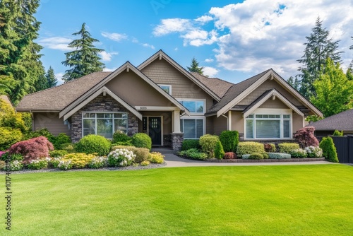 A brown, modern, two-story house with a stone facade and a lush green lawn in front of it. The house has a black door and white trim around the windows. There are trees and bushes around the house.
