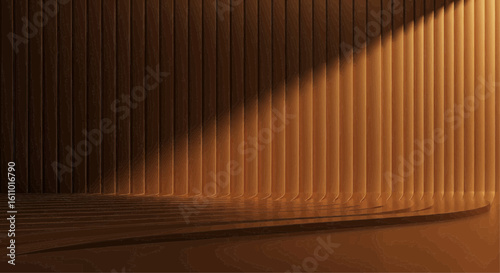 A brown, textured wall with vertical lines and a curved platform, illuminated by a diagonal beam of light.
