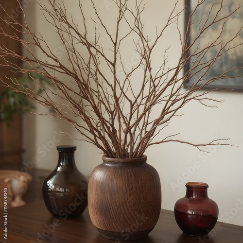 A brown vase with a brown branch in it sits on a table next to two other vases