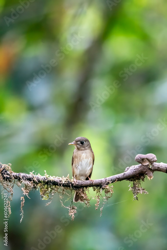 A brown-breasted flycatcher perched on a small branch in the deep jungles of Thattekad, Kerala