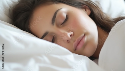 A brunette woman sleeping in her bed, clean and white bedroom. Generative IA