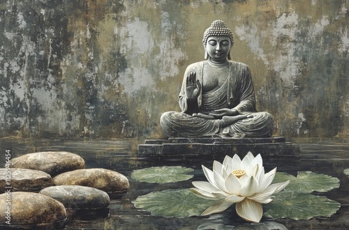 A Buddha statue in a lotus position, surrounded by rocks, pebbles, and green leaves, with a blooming white lily flower.