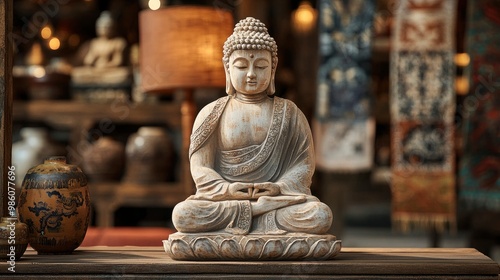 A Buddha statue made of carved wood, displayed on a simple, rustic shelf with a backdrop of traditional Asian textiles. The warm, ambient light from a nearby lamp highlights the intricate details of
