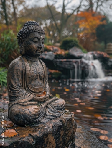 a buddha statue stands near a waterfall