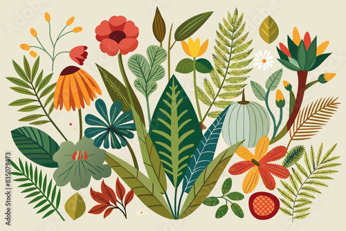 a bunch of flowers and leaves in a vase, Rustic botanical illustrations featuring local flora