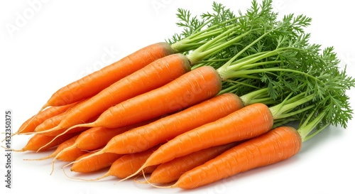 A bunch of fresh carrots with green tops neatly arranged on a white surface in a studio setting