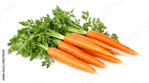 A bunch of fresh carrots with their green tops still attached, neatly arranged on a white background, highlighting their vibrant orange color.