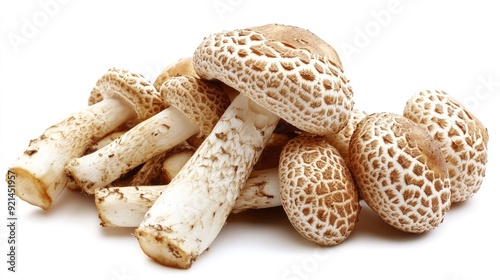 A bunch of fresh Matsutake mushrooms, emphasizing their unique textures and shapes on a white background.