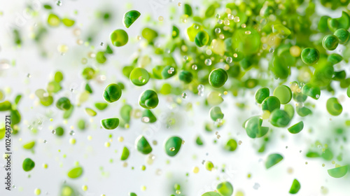 A bunch of green peas falls into the salad. A handful of green peas on a white background hovers in the air. A natural product. Food background. The image turns out to be light and airy