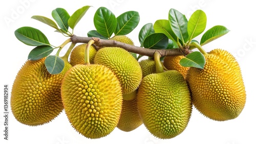 A Bunch of Ripe Jackfruits Hanging on the Tree Branch with Lush Green Leaves Isolated on White Background