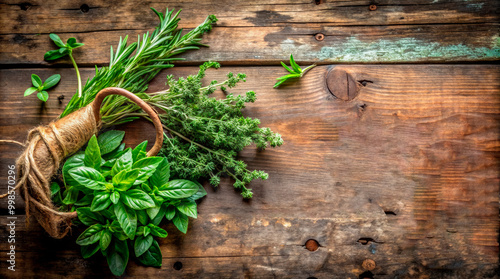 A bundle of fresh herbs tied with twine on a rustic wooden surface.