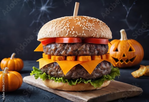 A burger with a pumpkin-shaped bun and a face made out of beef patties and vegetables, with creepy decorations in the background