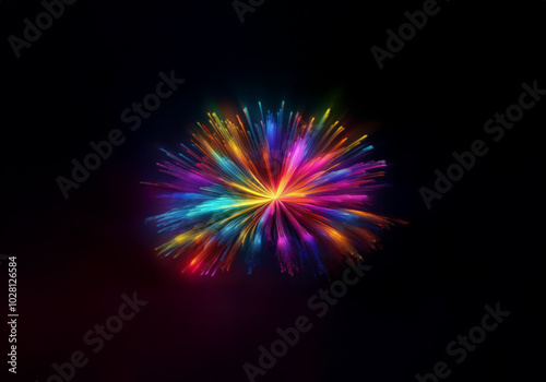 A burst of colorful lines radiate outward from a central point, creating a dynamic, almost explosive effect.