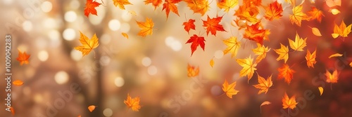 A burst of orange and red autumn leaves illuminated by bright light, creating a warm, dreamy bokeh effect.