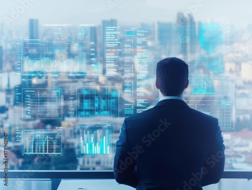 A business leader in a sleek office overlooking a city, surrounded by floating holographic sales data and predictive analytics charts