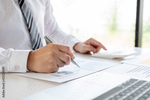 A business man is sitting at a desk and calculating financial graphs about real estate investment expenditures