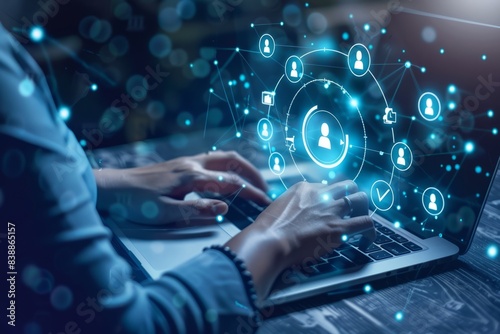 A business person uses a laptop to create target audience ICONS,Digital marketing online, CRM, Data exchanges development and customer service.