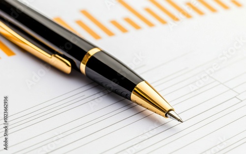 A business plan document, papers and pen, flat lay, modern style, isolated on white background
