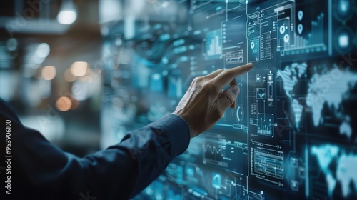 A business professional interacts with a digital dashboard, showcasing advanced analytics and data visualization technology.