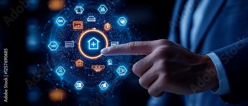 A business professional interacts with a digital interface, highlighting various icons related to home automation and smart technology.