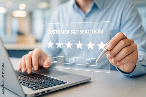 A business professional uses a digital interface to evaluate customer satisfaction, highlighting service quality, feedback, and performance metrics.