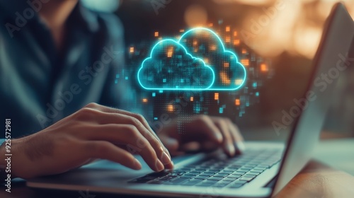 A business professional using a cloud migration tool on a laptop, with a digital cloud icon in the background.