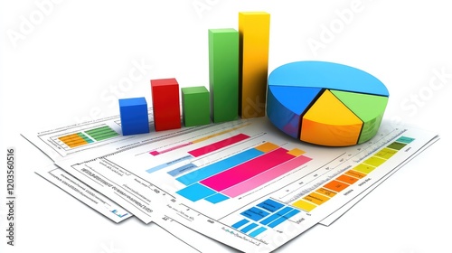 A business strategy plan featuring a pie chart, arrows, and financial documents, offering ample room for copy and branding space.