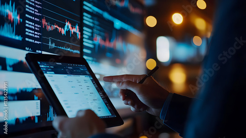 A business team collaborating in a monitoring room, with one member analyzing stock market data.