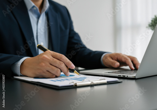 A businessman analyzes charts while typing on a laptop in a modern office setting during daylight