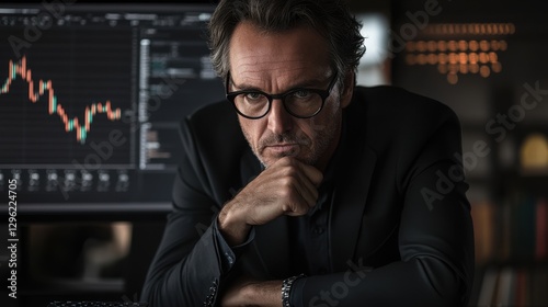 A businessman, clad in sleek attire, hunched over a modern computer, his gaze fixed on a virtual dashboard displaying vibrant financial charts, sales data, and a dynamic economic growth graph. His