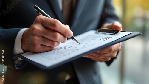A businessman giving the final approval on a project checklist. The design highlights the importance of thorough verification and is perfect for showcasing your commitment to delivering work.