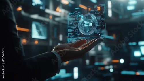 A businessman holding a holographic screen displaying digital data in his hand, rendered in 3D.