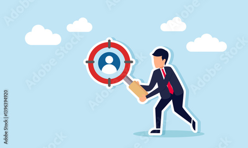 A businessman holding a magnifying glass shaped like a focus target while observing someone's profile, illustration of finding the right and suitable job candidate