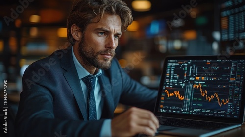 A businessman in a suit sits in a cafe, looking intently at a laptop screen displaying a stock market graph.