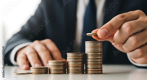 A businessman in a suit stacking coins in ascending order, symbolizing financial growth and investment