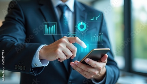 A businessman in a suit uses a smartphone projecting futuristic data dashboards, charts, and graphs, representing mobile data analysis, AI, and smart business decision in a modern office setting