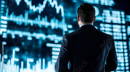 A businessman in a suit viewing stock market data and charts on a digital screen, symbolizing investment analysis, financial strategy, and market trends.