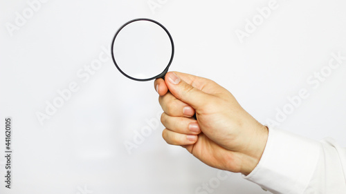 A businessman in a white shirt is holding a magnifying glass. white background. business and finance
