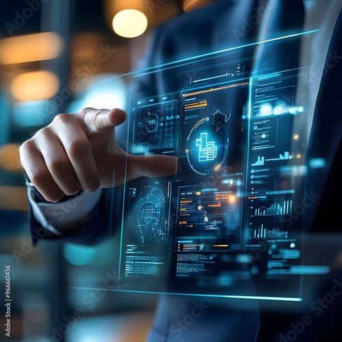 A businessman interacting with a virtual project management dashboard, symbolizing efficient planning and implementation of a successful project.