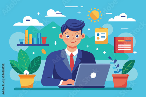 A businessman is focused on entering data into his laptop at a desk surrounded by plants and decorations, Businessman using laptop and entering data, flat illustration.