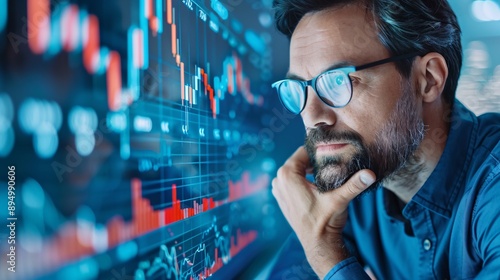 A businessman is looking at a computer screen with a lot of numbers and graphs. He is wearing glasses and he is deep in thought.