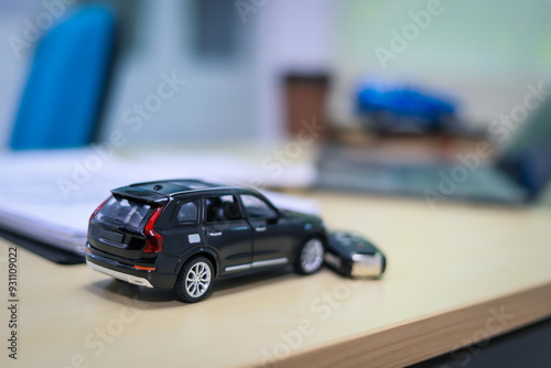 A businessman is working at his desk, focused on car financing, car sales, and insurance. He is analyzing customer data related to automobile financing and crafting strategies to improve sales