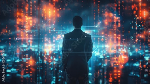 A businessman overseeing personalized customer experiences, with glowing data points adjusting in real-time to customer behavior.
